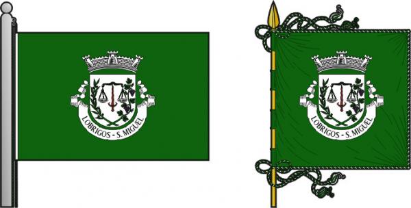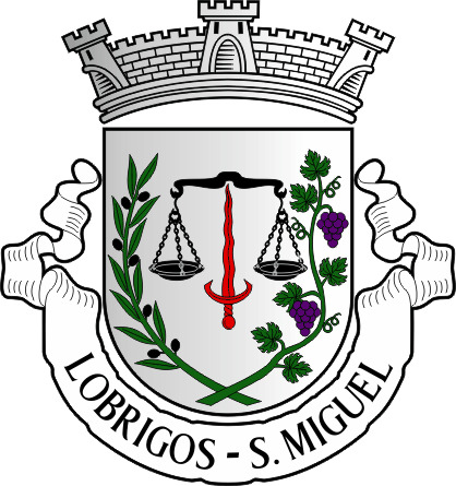 Coroa mural de prata de três torres. Listel branco com a legenda a negro, em maiúsculas: “ LOBRIGOS – S. MIGUEL “.